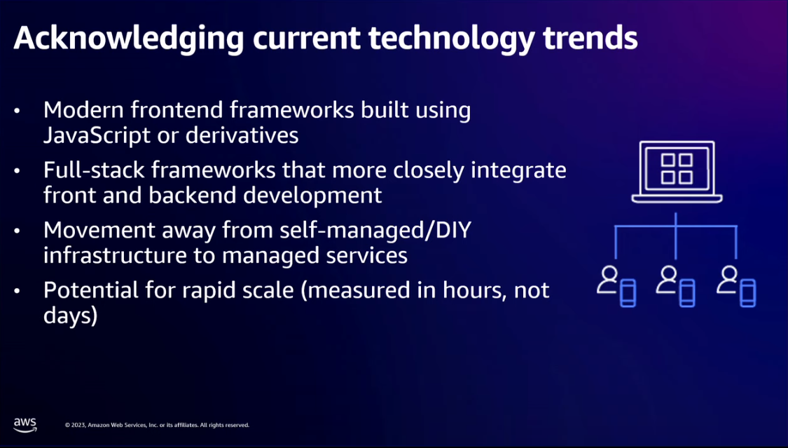 - Acknowledge current technology trends: modern JavaScript frameworks, Full-stack frameworks, moving away from self-managed/DIY infra to managed services, potential for rapid scale (measured in hours, not days)