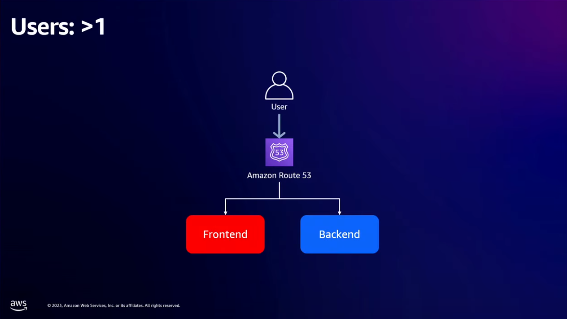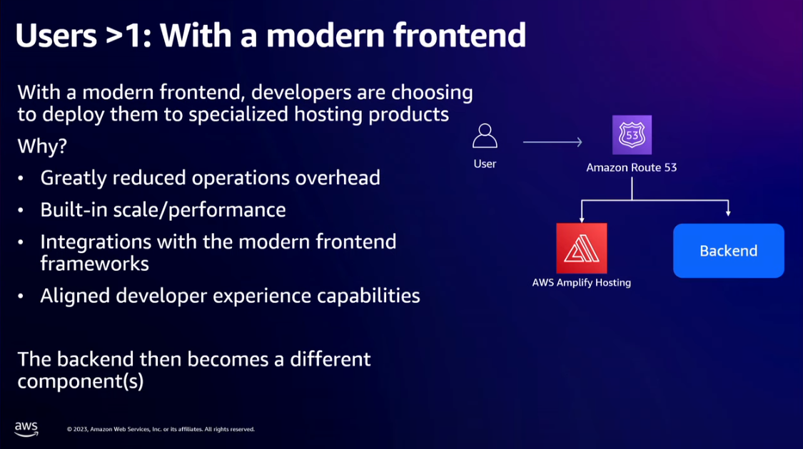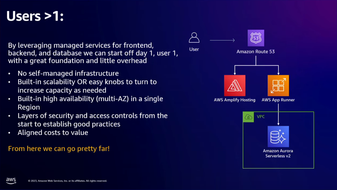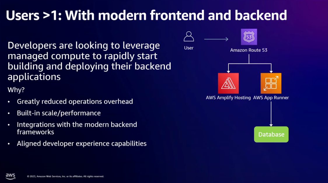 - Now our modern app on AWS is made of AWS Route 53 (for DNS), AWS Amplify Hosting (for hosting frontend), AWS App Runner (for both backend servers and exposing the APIs), and Amazon Aurora Serverless v2 (for relational database).