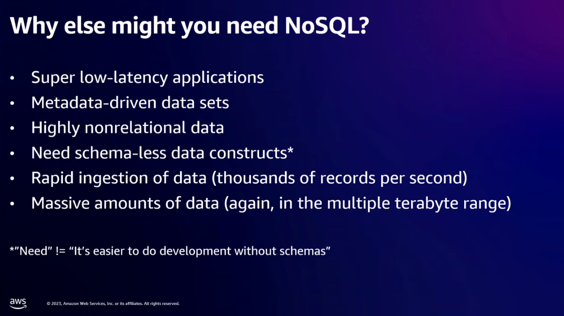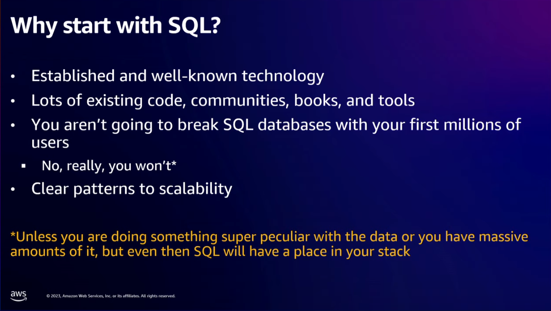 - For database, choose SQL vs NoSQL -> Start with SQL database. Unless you have a "massive" amount of data. "Massive" here means multiple terabytes of data in year 1 or an incredibly data-intensive workload.