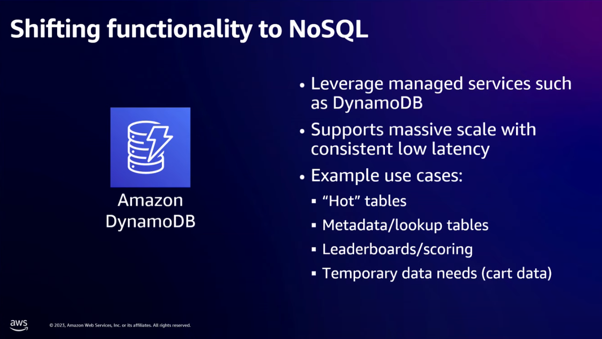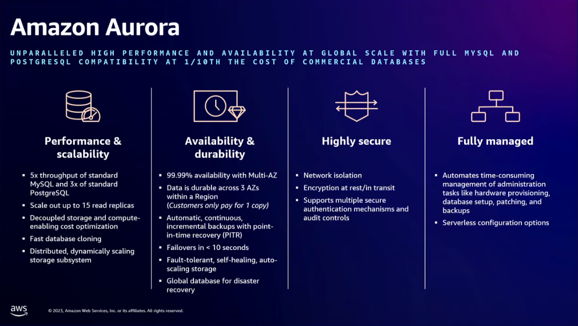 - You can host the SQL relational database (MySQL and PostgreSQL) on Amazon Aurora. It supports auto-scaling. Use Amazon Aurora Serverless v2 to decouple the compute and the storage layer in fine-grained increments. This is important to reduce the cost. It will autoscale the databases only when there's a high load from your users, and then it will scale down again.