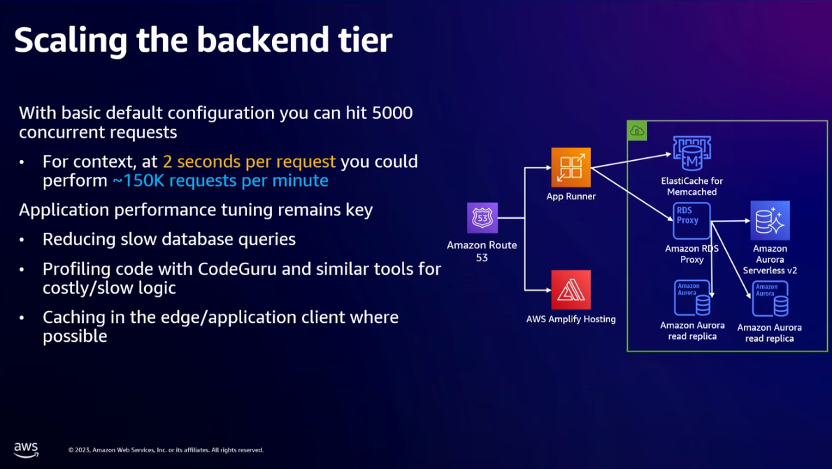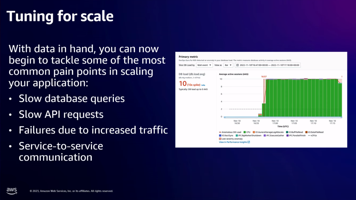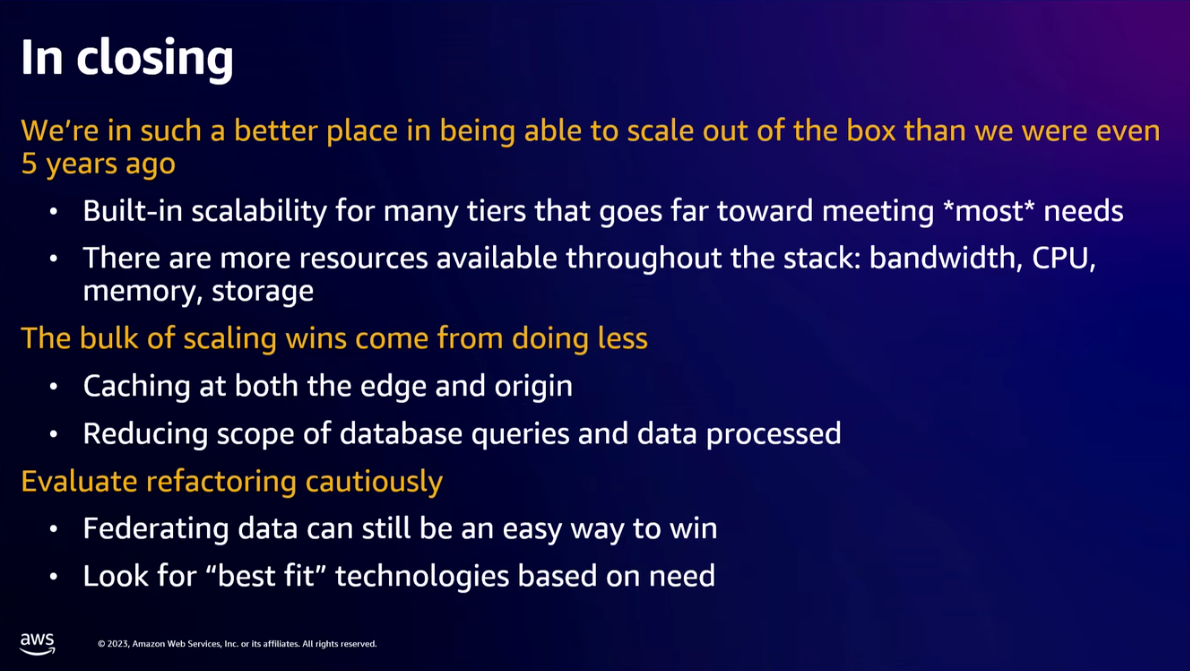 - You want to be able to dive really deep into your stack performance. Your observability tools, monitoring tools, and code profiling tools become incredibly important, key, and critical to understanding where and how to scale further.