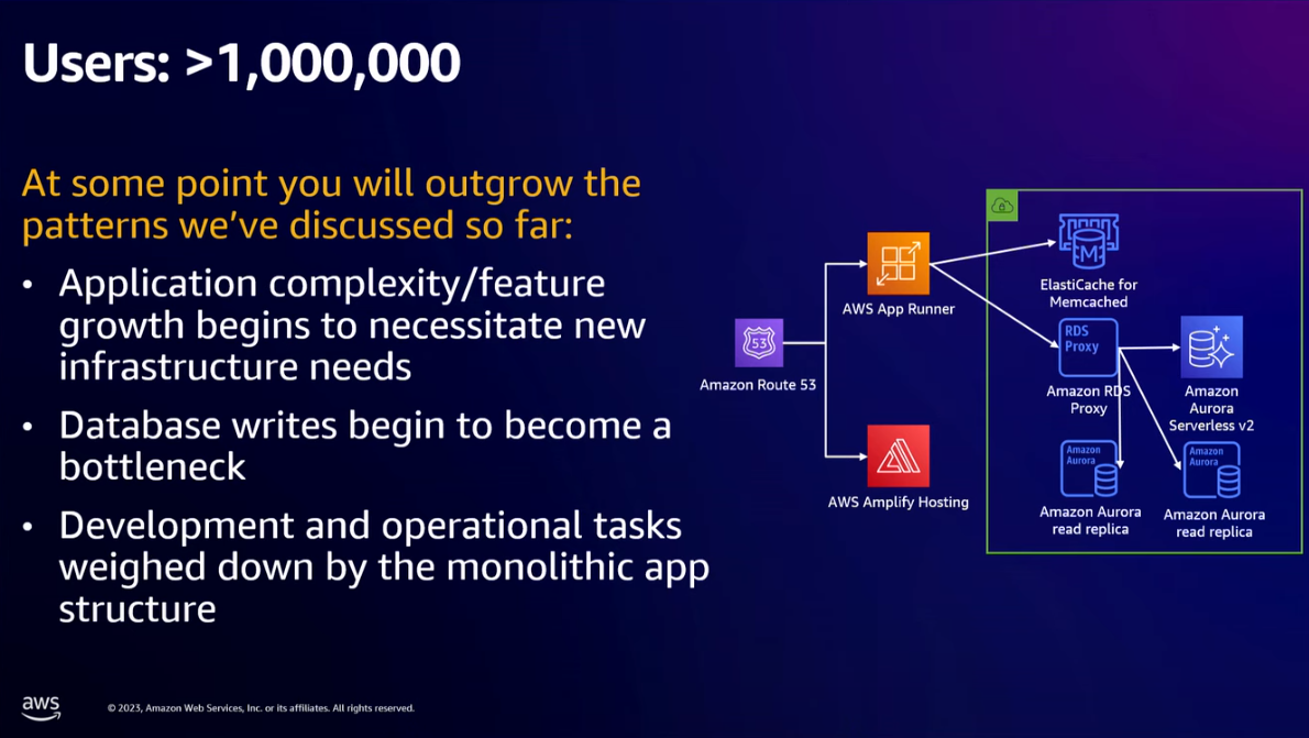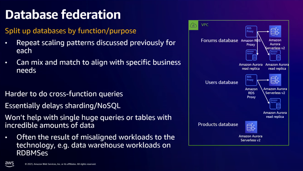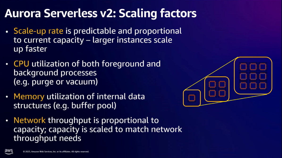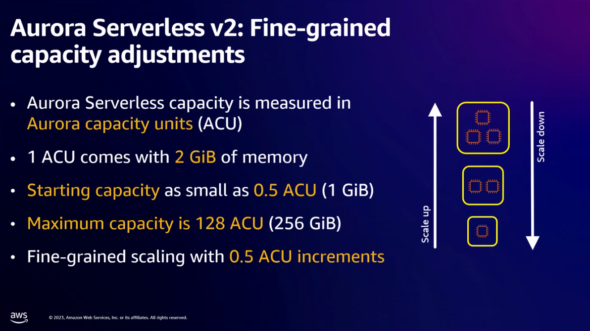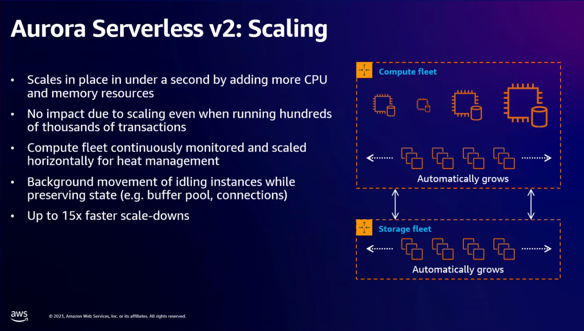 - You will get to the point where either compute or storage is your bottleneck. Amazon Aurora Serverless v2 detach these 2 so that you can scale it independently.