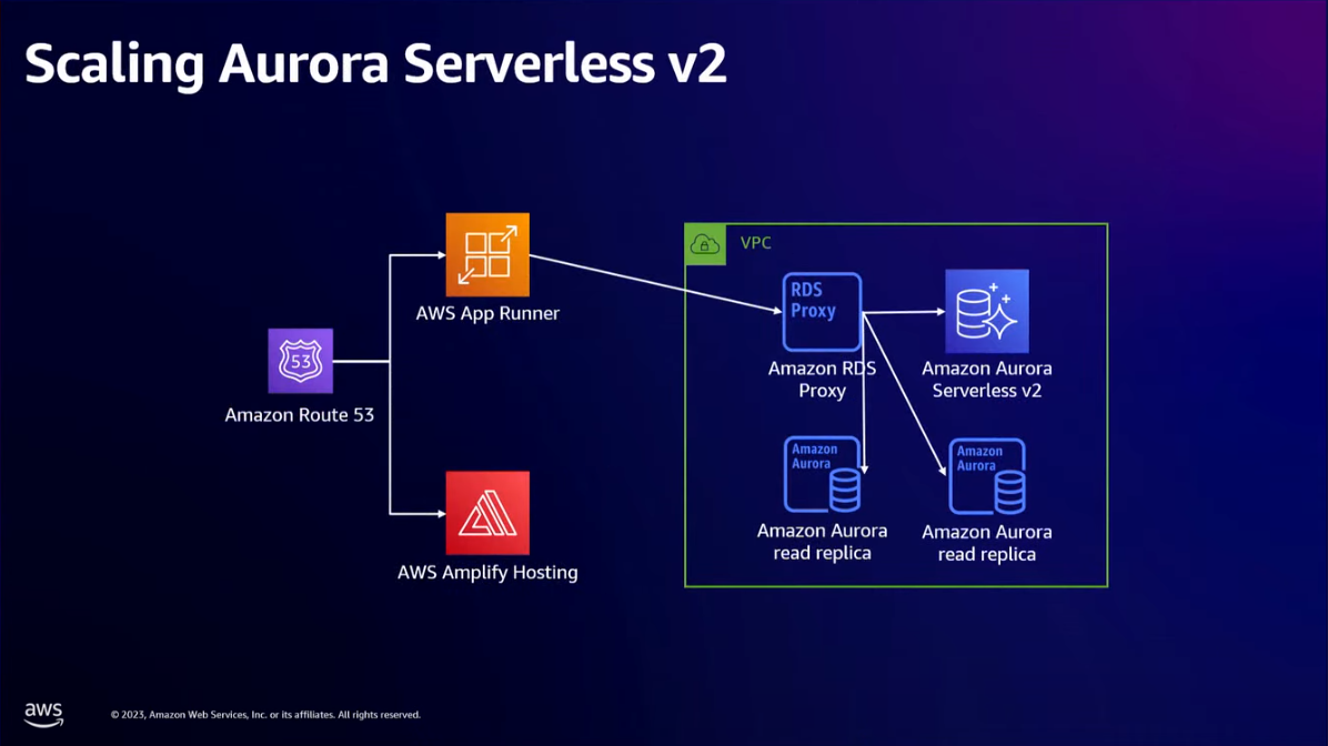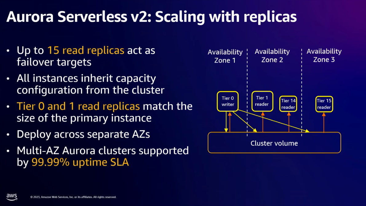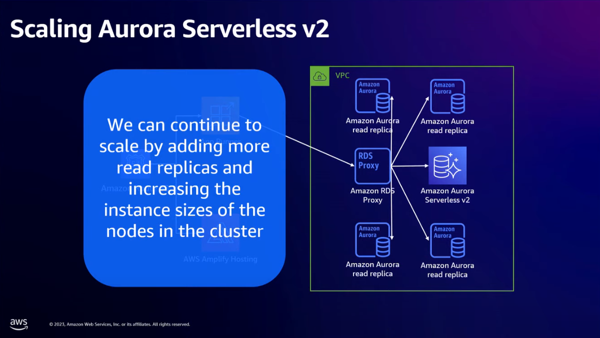 - Aurora Serverless v2 supported up to 15 read replicas. When you have added read replicas and grow the Aurora clusters. Some customers have 20:1 to 30:1 read:write demand, and they will add a database proxy such Amazon RDS Proxy. Database proxy has been around in the MySQL and PostgreSQL world for a long time.