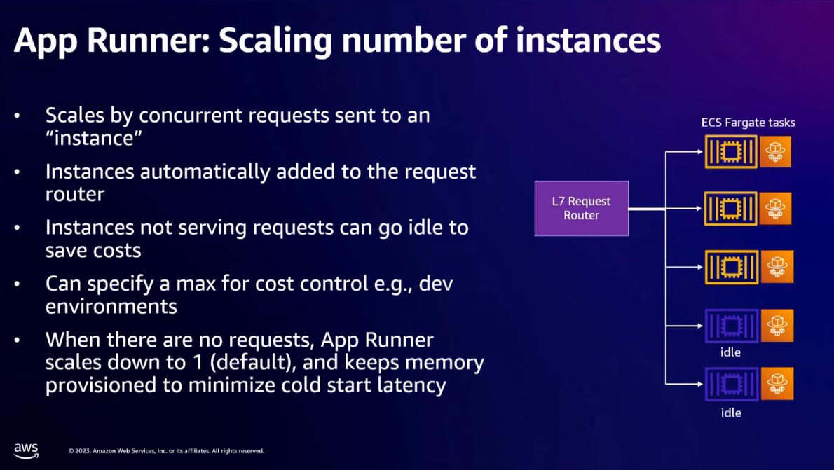 - App Runner will manage to scale the tasks for you. It automatically adds instances to the request router when there's an increase of concurrent requests sent to an instance. Instance not serving requests will go idle, and when there are no requests, App Runner scales down to 1 (default) while still keeping the memory provision to minimize cold start latency.