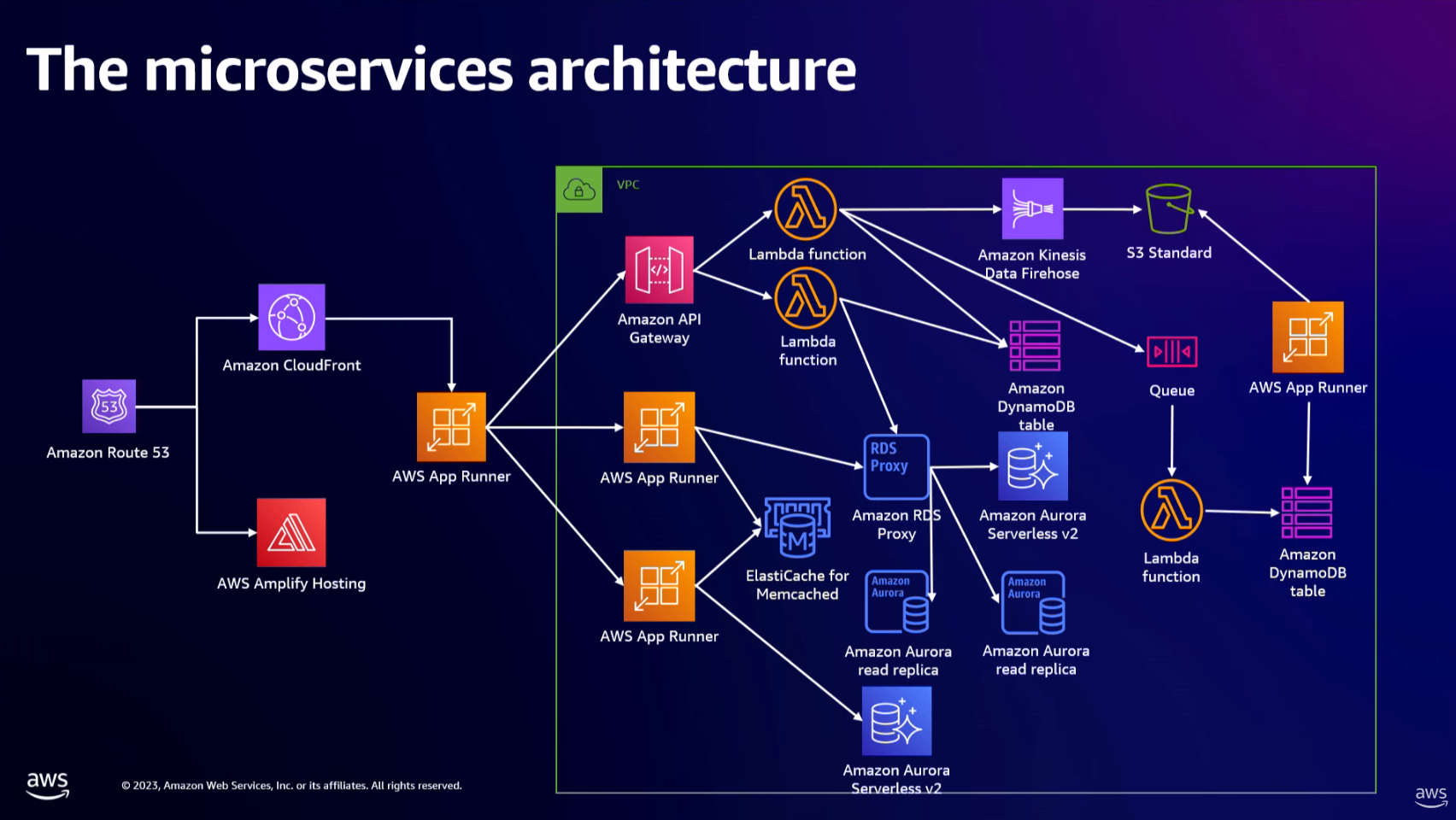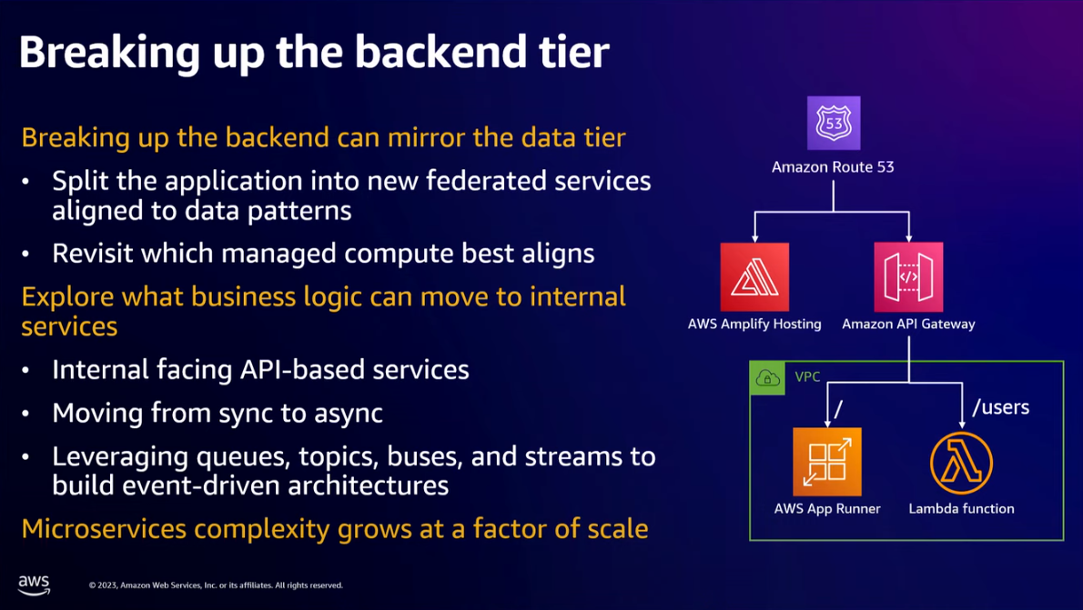 - Breaking up the backend tier into microservices by mirroring the data tier. A single App Runner application becomes multiple App Runner applications.
