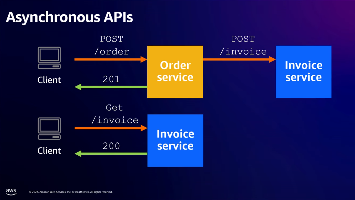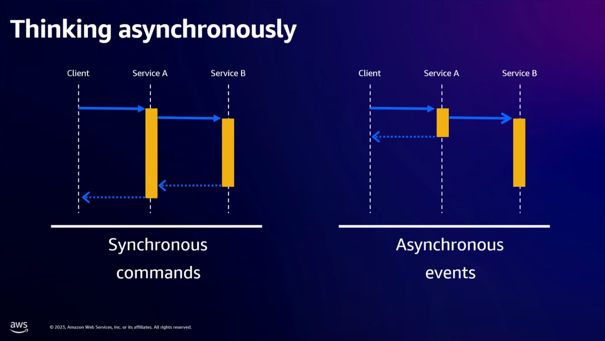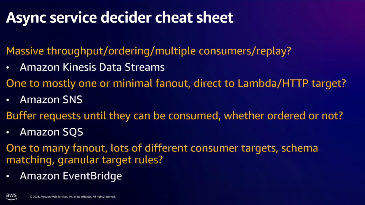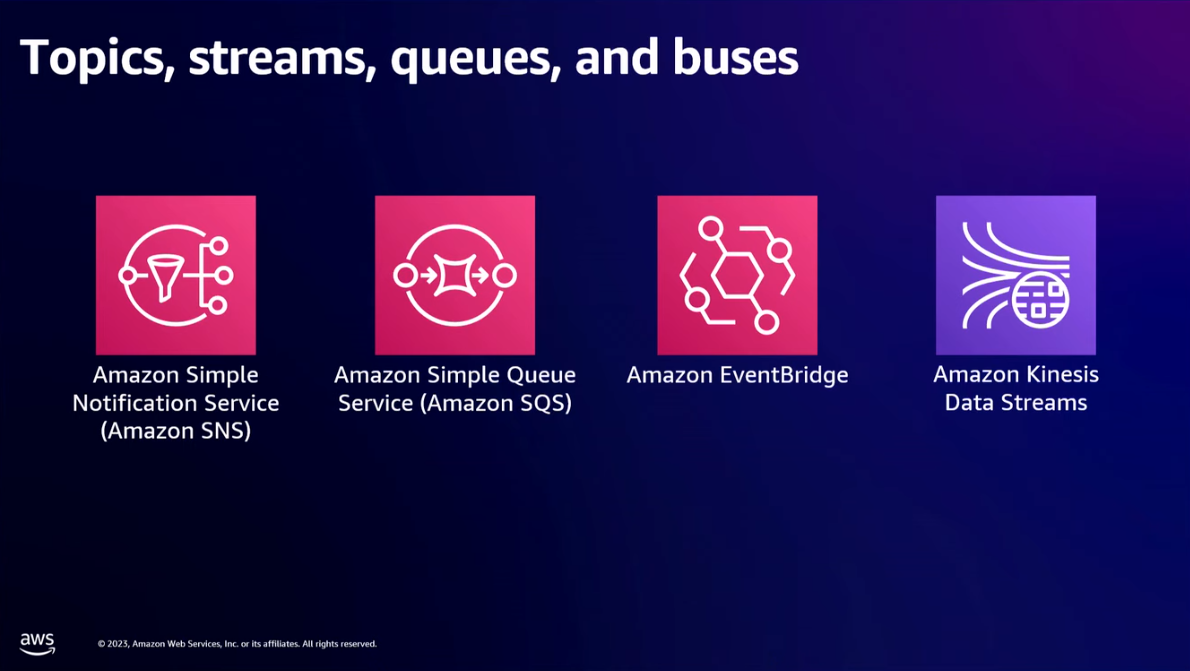 - Beyond having API calls to API calls, there are other ways to pass events from Service A to Service B. You can use topics, streams, queues, and buses e.g. Amazon SNS (Simple Notification Service), Amazon SQS (Simple Queue Service), Amazon EventBridge (basically a message bus hub between different services), and Amazon Kinesis Data Streams (allows you to ingest information fast and spread out information at scale).